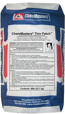 ChemMasters Thin Patch mortar is a blend of graded quartz, silica sand, cements and proprietary additives. It is a single-component, polymer-modified mortar, requiring only water for mixing. Thin Patch is specially formulated for thin repairs from a featheredge to one inch. It has a smooth texture that is easy to finish with a broom, float or trowel.