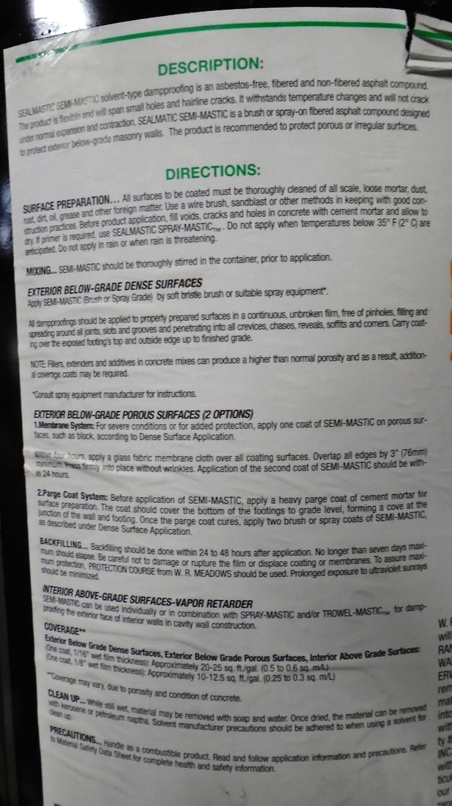 W.R. Meadows Sealmastic semi-mastic, solvent-type dampproofing is an asbestos-free, fibered and non-fibered asphalt compound that is flexible and will span small holes and hairline cracks.