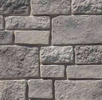 Dutch Quality Rough Ashlar Graystone is a popular manufactured stone profile that is defined by long, linear pieces of varying heights and a distressed, aged surface. Each stone is shaped to ensure tight dry-stack installation and gives moderate shadow relief, even when grouted.