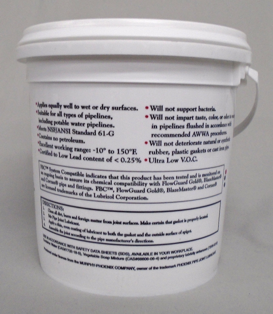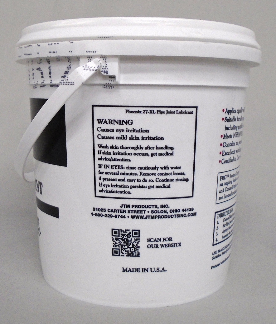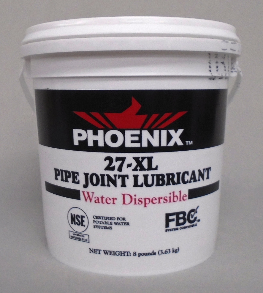 JTM Products Phoenix 27-XL is a water-dispersible pipe-joint lubricant certified to meet NSF/ANSI Standard 61 for use in potable water systems. Its creamy consistency allows the installer to apply a smooth, consistent coating of pipe-joint lubricant to both the gasket and the pipe.
