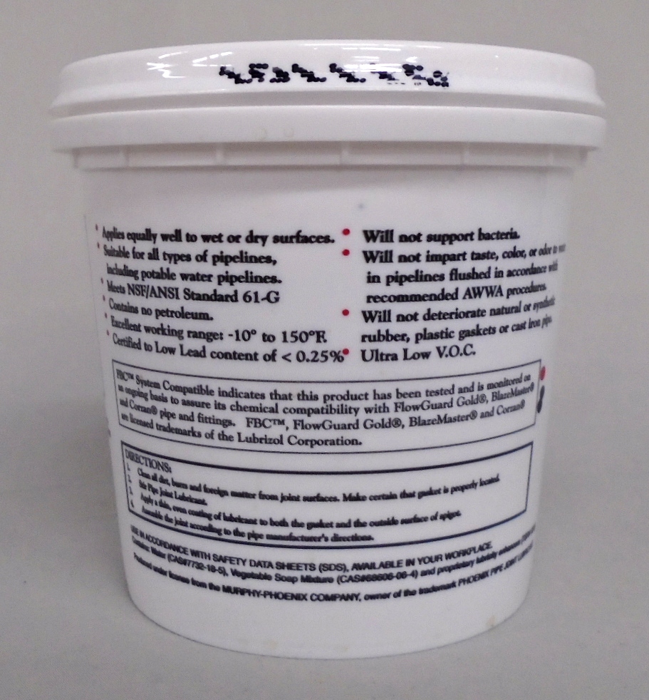 JTM Products Phoenix 27-XL is a water-dispersible pipe-joint lubricant certified to meet NSF/ANSI Standard 61 for use in potable water systems. Its creamy consistency allows the installer to apply a smooth, consistent coating of pipe-joint lubricant to both the gasket and the pipe.