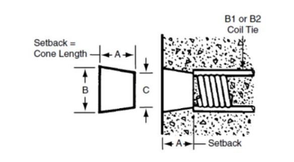 These loose wood cones are placed over the coil bolt after the bolts have been put through the formwork and before the bolt is threaded into the coil tie. The large end provides a sufficient bearing surface to prevent damage of the plywood form. The wood cones are generally considered to be a single use item.