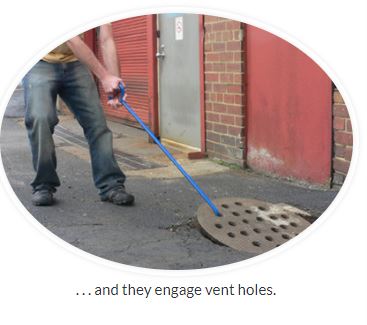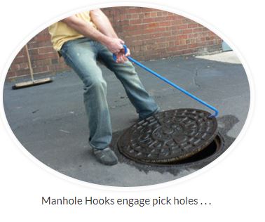 This Trumbull manhole cover hooks are made of 5/8" hexagonal steel. The 1/2" point engages the lid of the manhole cover. Hooks are painted in safety blue enamel paint for safety and durability.